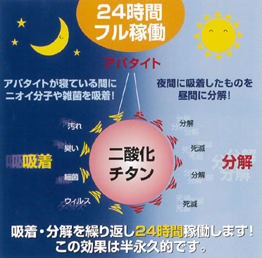 光触媒リスタコートとは、光触媒の作用(紫外線を照射すると消臭や抗菌を行うこと)によって、塗面のよごれや臭いをきれいにするコーティング剤です。しかも、光が及ばなくなった場合でも、アパタイト(燐灰石)が臭いや細菌を吸着し、光が差し込んだ時にこれらを分解します。このリスタコートはセラミックの特性を持つため、耐薬品性、耐摩耗性・耐久性に非常に優れており、リスタコートの1回塗りは、ワックス3回塗り以上の光沢があります。しかも、リスタコートの主成分は無機質のシリコーンであるため、変色する心配がありません。